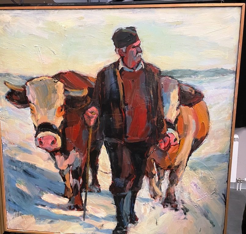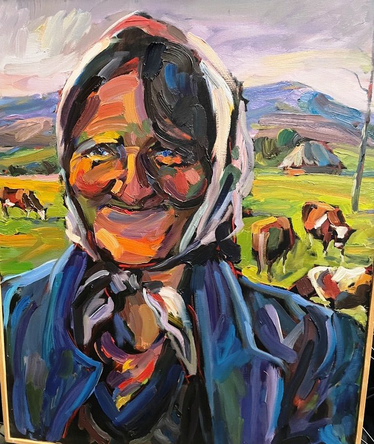 U Džingijevim platnima figura nikada nije izdvojena iz sveta koji je okružuje – pejzaž je uvek prisutan, ali ne kao dekor već kao prirodni produžetak čoveka. U sceni pastira sa govedima, u licima starica koje se smeju pred crnim fondom ili u portretu žene naspram planinskog horizonta, prepoznaje se ista temeljna linija: spoj identiteta i opstanka. Boja i potez u tim slikama postaju instrumenti sećanja – energični, vitalni i svedeni na suštinu izraza.
