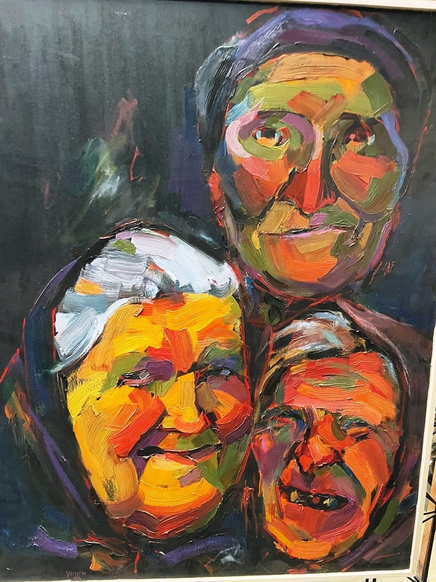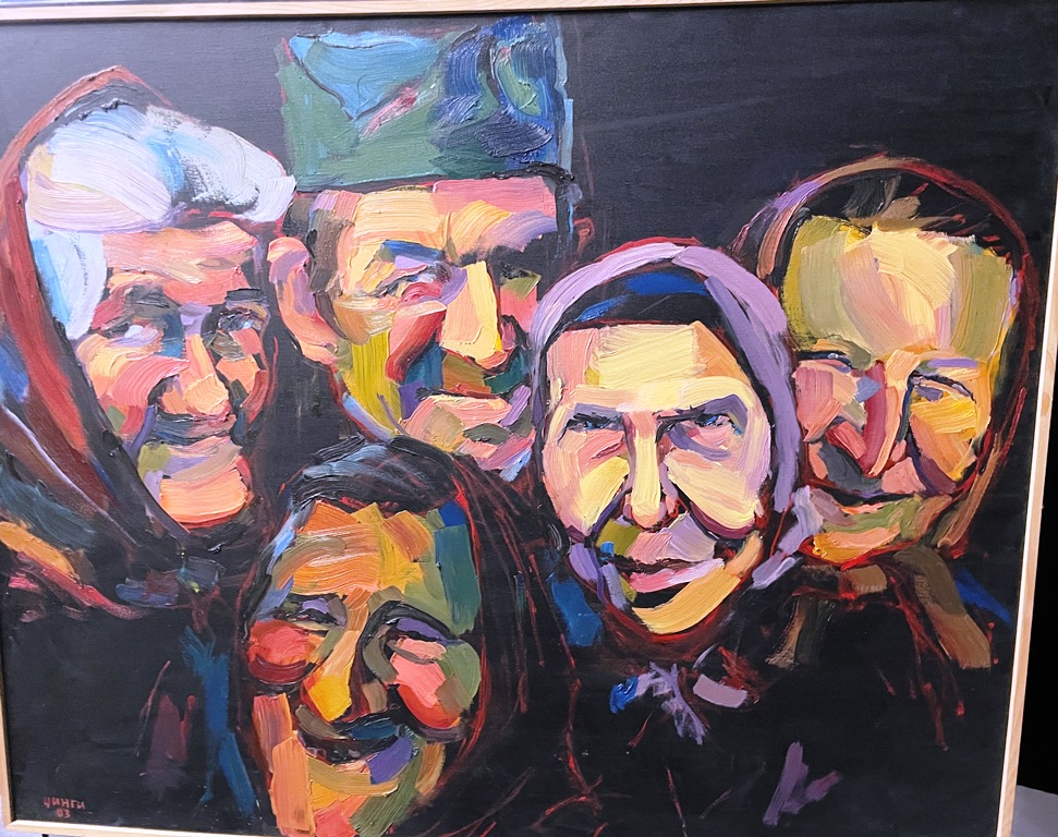 Slika sa pet lica deluje kao ikonostas narodnog sećanja. To je, sasvim sigurno, portret kolektivnog identiteta, gde svako lice funkcioniše i kao individualni karakter i kao segment zajedničkog izraza: osmeha, tuge, trpljenja i solidarnosti. Boja je ovde ne samo sredstvo opisivanja već i nosilac afekta: crvene i žute površine postaju psihološki toplotni impulsi, dok tamna pozadina čini da figure isplivavaju iz tame istorije u svetlo slike. Taj kontrast između svetla i tame nije samo slikarski nego i simbolički kao da je između prošlosti i opstanka, između nestajanja i sećanja.