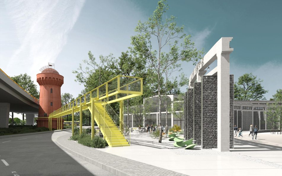 Osim samih objekata, projekat snažno radi i sa javnim prostorom: okretnica je pretvorena u otvoreni trg koji povezuje unutrašnje funkcije sa gradom i obalom reke. Urbanistički elementi – pešačke rute, zelene površine i komplementarne platforme osmišljeni su da pozovu prolaznike i da podstaknu neposrednu upotrebu prostora, čime se postiže kontinuitet između industrijske prošlosti i nove, dnevne kulturne dinamike.