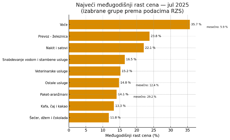 - Voće – ekstremno visok međugodišnji porast (+35,7 %) i značajan udeo u prehrambenoj potrošnji čine voće verovatno najvećim pojedinačnim doprinositeljem inflaciji u julu.